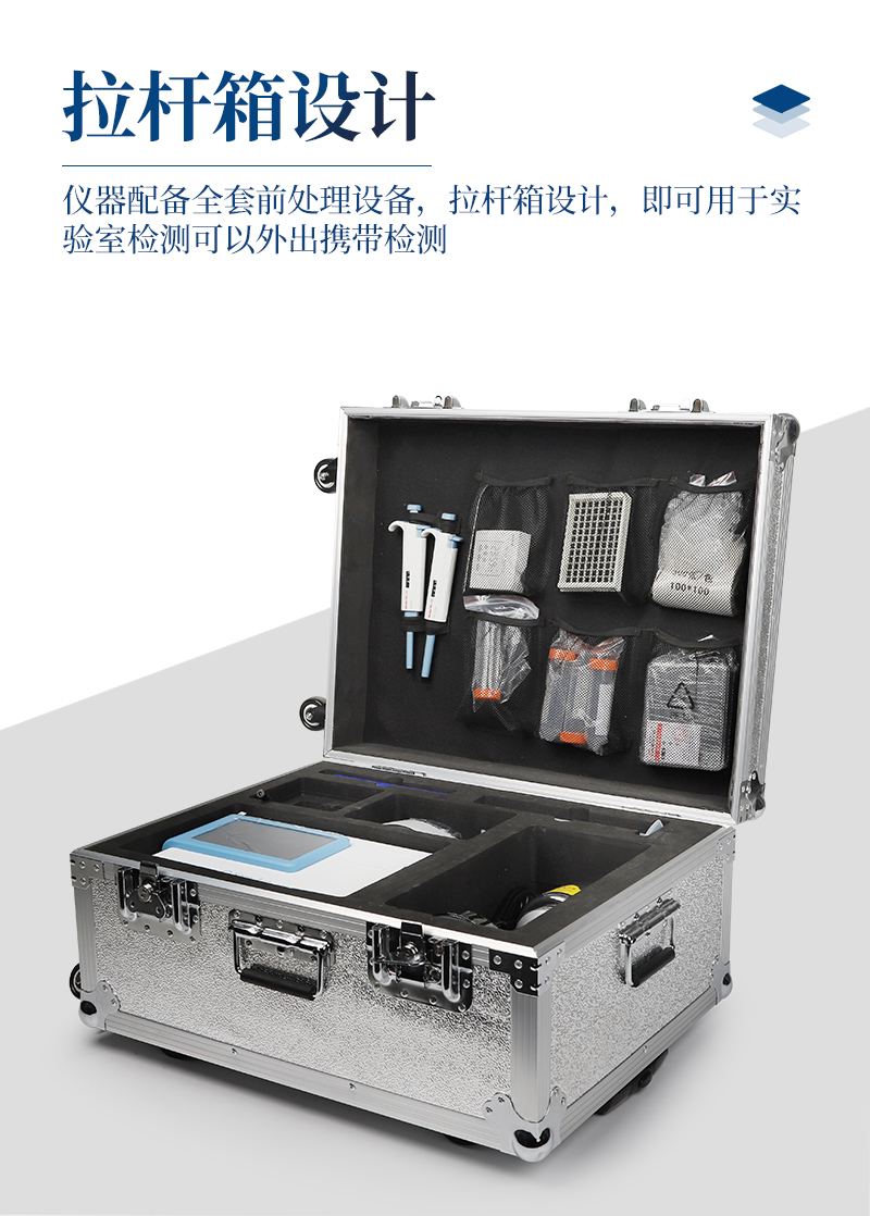 12、儀器配備全套前處理設(shè)備,拉桿箱設(shè)計(jì),即可用于實(shí)驗(yàn)室檢測(cè)可以外出攜帶檢測(cè)。