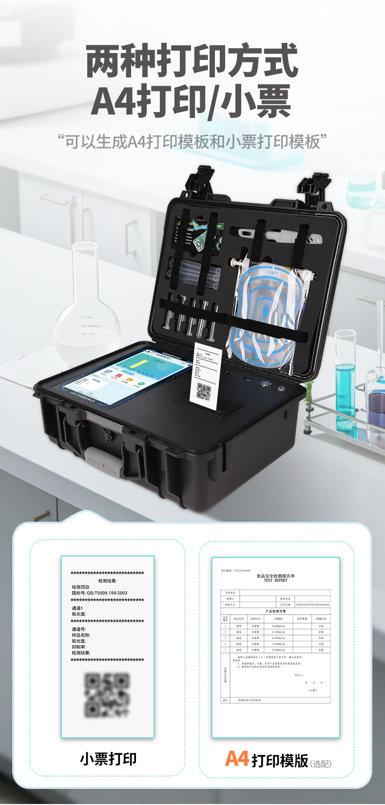 10、A4紙版本報告打印功能:設(shè)備擁有兩種結(jié)果展示方式,可以自動生成A4打印模板和小票打印模板兩種樣式,可通過WiFi及網(wǎng)線等方式鏈接外置打印機可進行打印