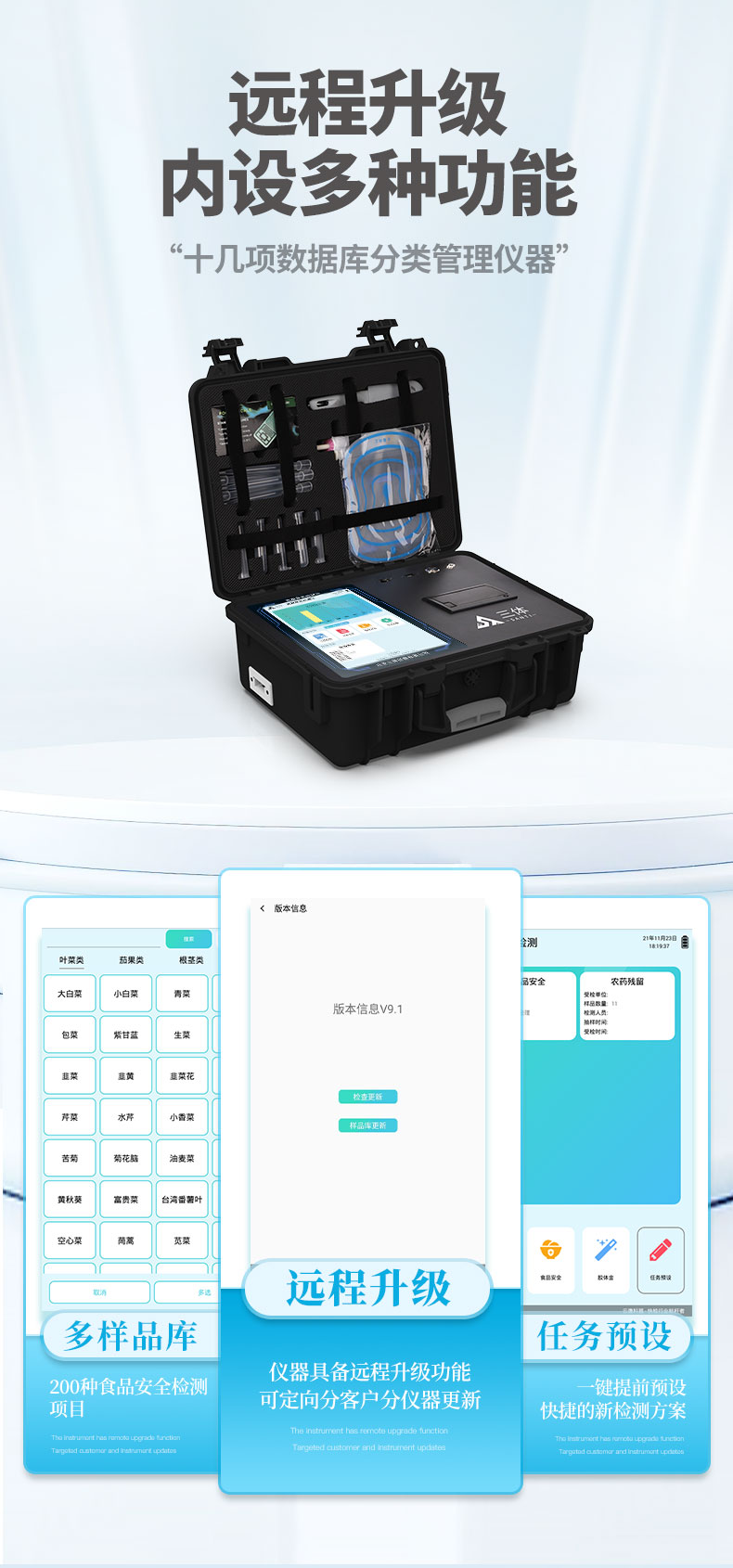 13、儀器具備遠程升級功能,可定向分客戶分儀器更新,開機后自動更新,并可持續(xù)性免費更新系統(tǒng)版本,無需像傳統(tǒng)產(chǎn)品返廠更新,節(jié)省時間及人力成本并避免了物流運輸返廠升級導(dǎo)致設(shè)備損壞的潛在風(fēng)險。
