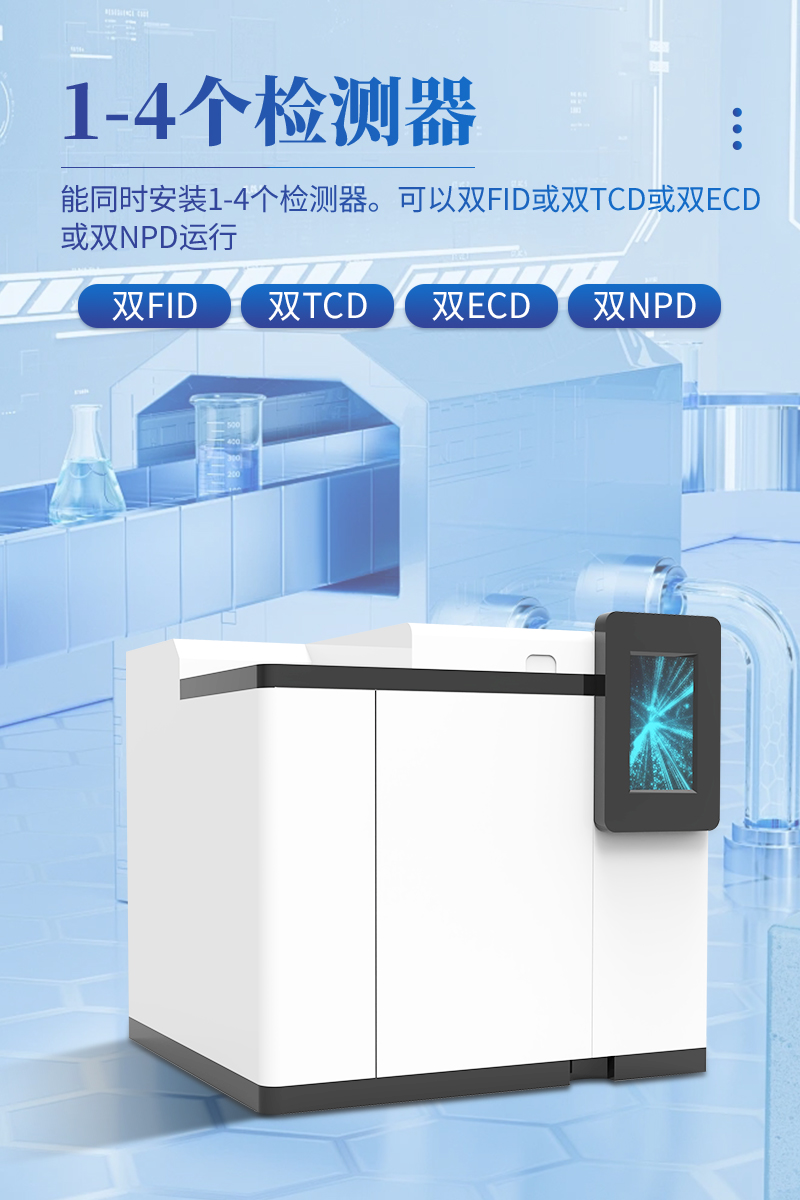 11.能同時安裝1-4個檢測器??梢噪pFID或雙TCD或雙ECD或雙NPD運行。TCD帶有雙路柱后補充氣,故可單柱、雙柱、毛細管柱使用。