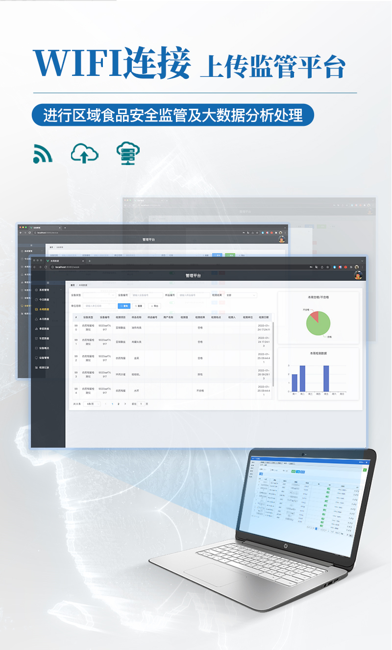 9.6、數(shù)據(jù)監(jiān)管系統(tǒng):同步對(duì)接監(jiān)管平臺(tái),數(shù)據(jù)可局域網(wǎng)和互聯(lián)網(wǎng)數(shù)據(jù)上傳,檢測(cè)結(jié)果可選擇直接傳至食品安全監(jiān)管平臺(tái)。進(jìn)行區(qū)域食品安全監(jiān)管及大數(shù)據(jù)分析處理與數(shù)據(jù)統(tǒng)計(jì),檢測(cè)區(qū)域食品安全長(zhǎng)短期動(dòng)態(tài),達(dá)到食品安全問(wèn)題預(yù)估、預(yù)警。