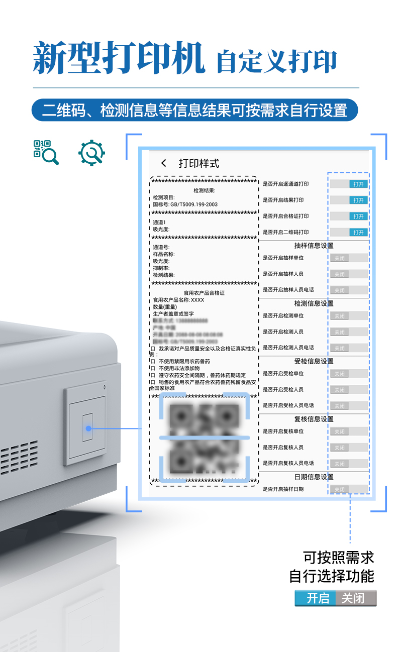 9.7.1、全新打印系統(tǒng):內(nèi)置全新打印機(jī),新創(chuàng)自定義打印方式,可按需靈活勾選控制:二維碼,抽樣信息、檢測(cè)信息,受檢信息、復(fù)核信息、抽樣日期、檢測(cè)日期等信息的打印。