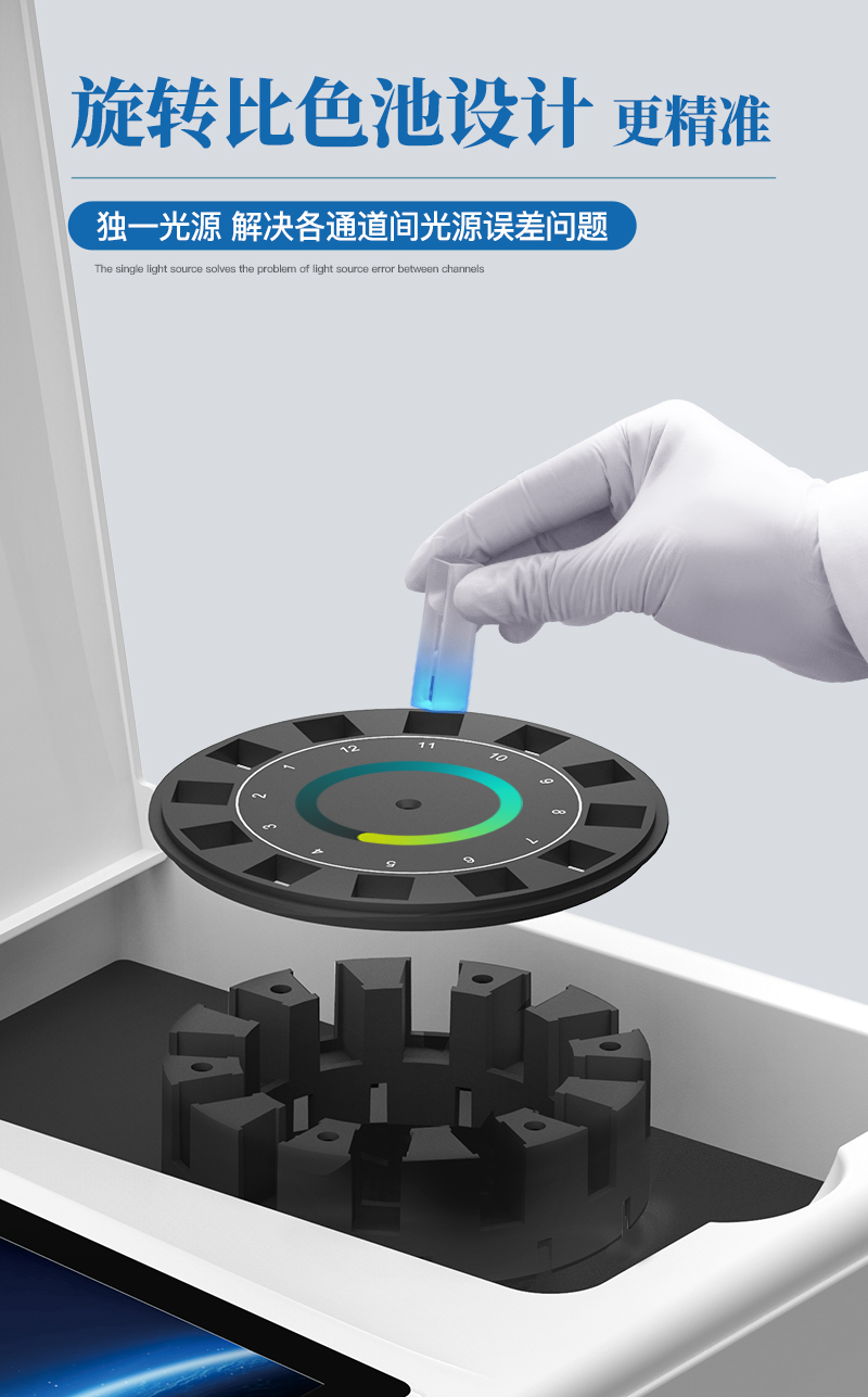 4、檢測(cè)通道:≥12通道;采用精密旋轉(zhuǎn)比色池設(shè)計(jì),使用同芯片同光源校準(zhǔn)精度,解決不同光源之間的誤差值,更加準(zhǔn)確高效。